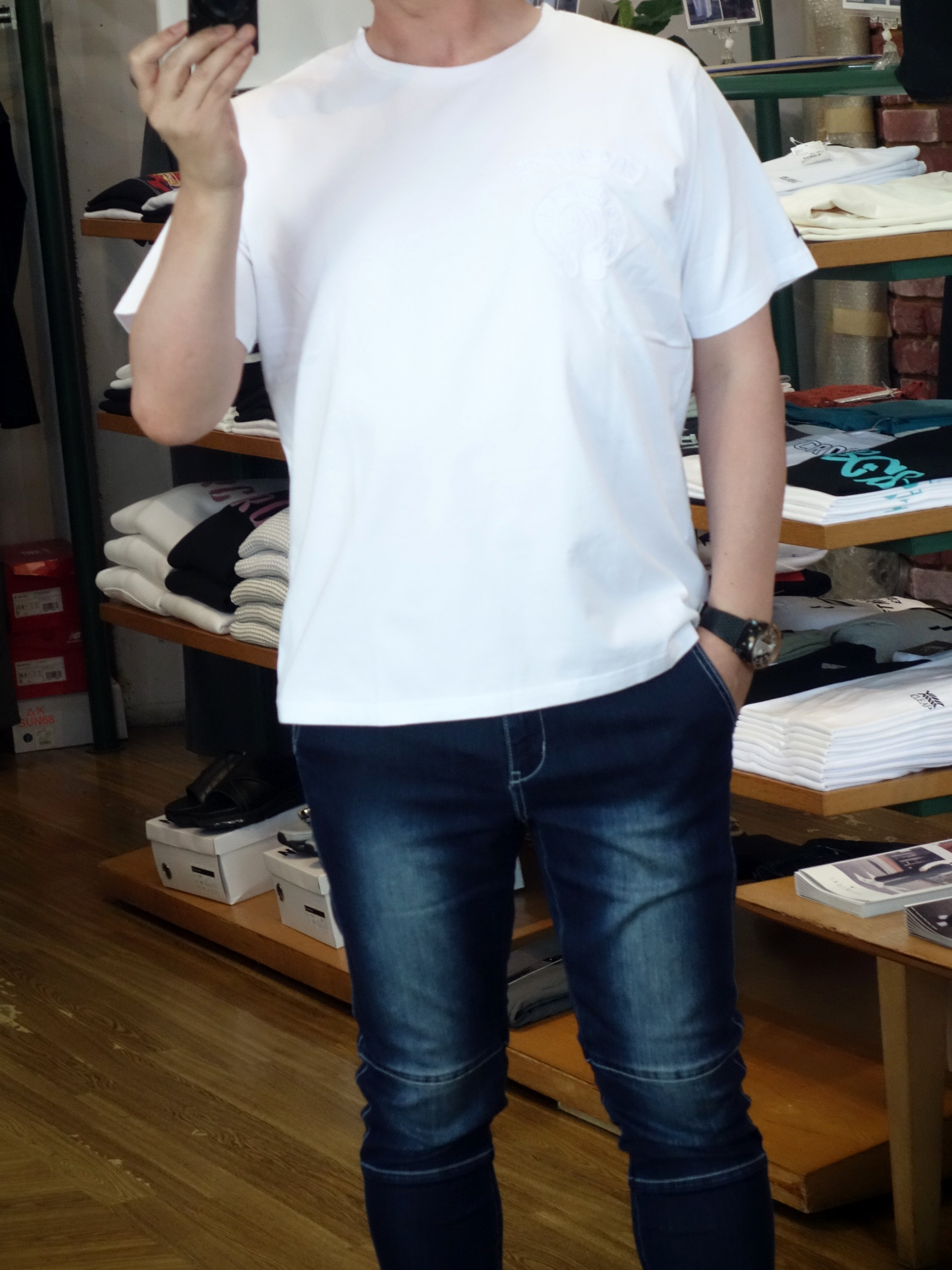 フロント左胸にボディと同色の生地をアップリケ。