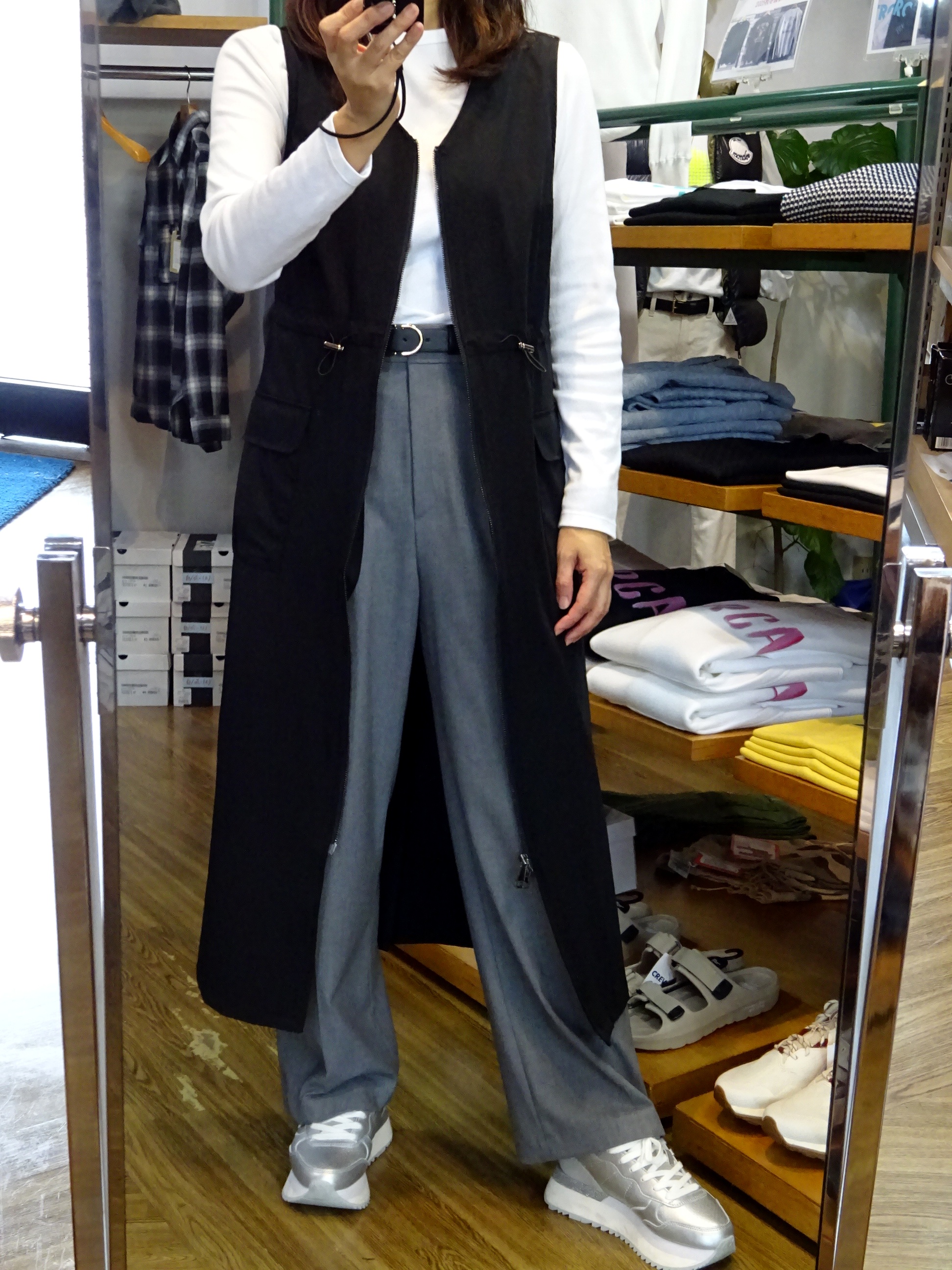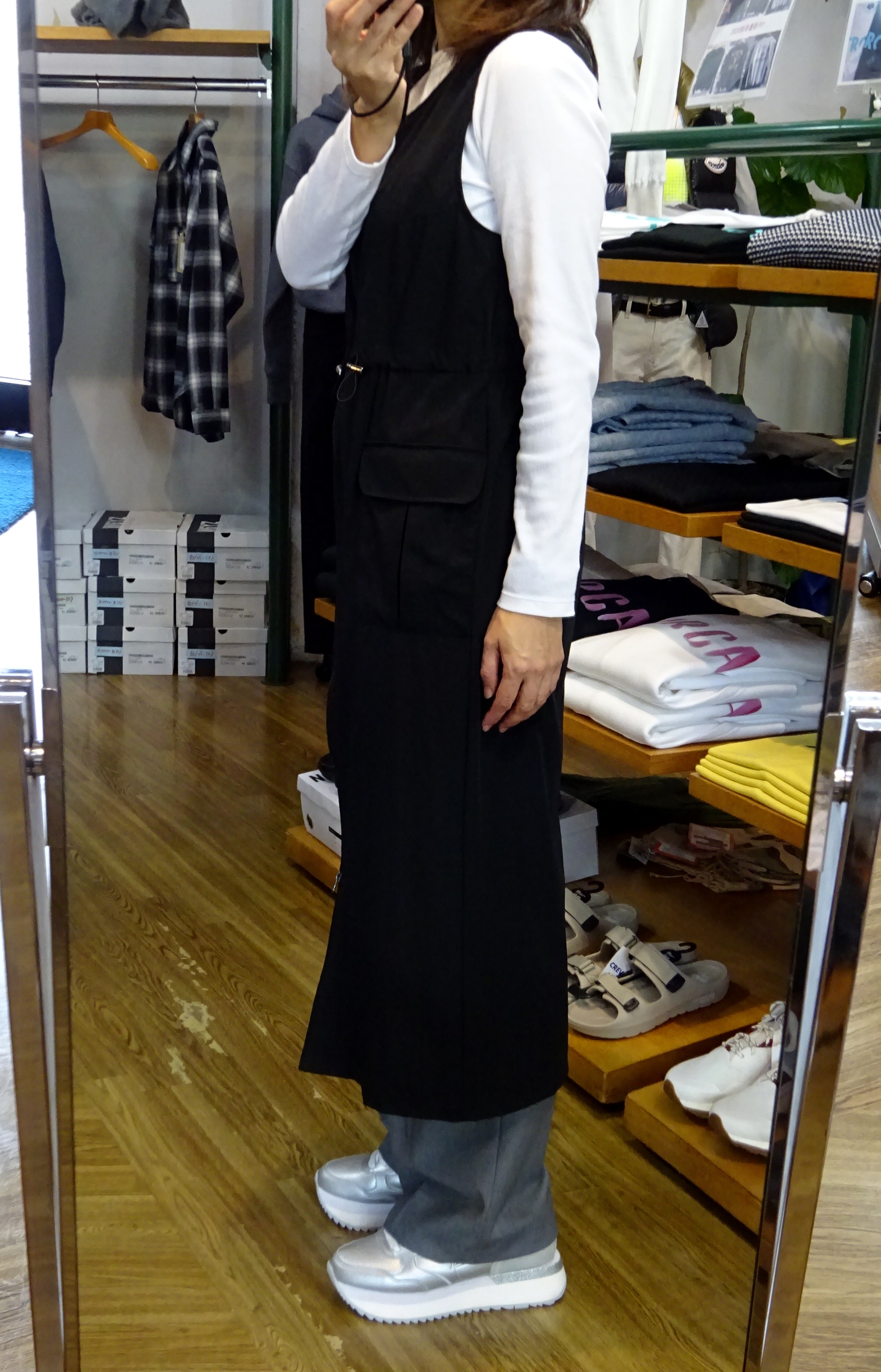 relaxing.Rの新作★フロントのZIPを閉じるとワンピースに♡開けるとジレのような羽織りになります! |  ウエスト部分にはローコードが付いていてお好みのシルエットに調整出来ます!両サイドにポケットが付いていて便利ですよ! |
