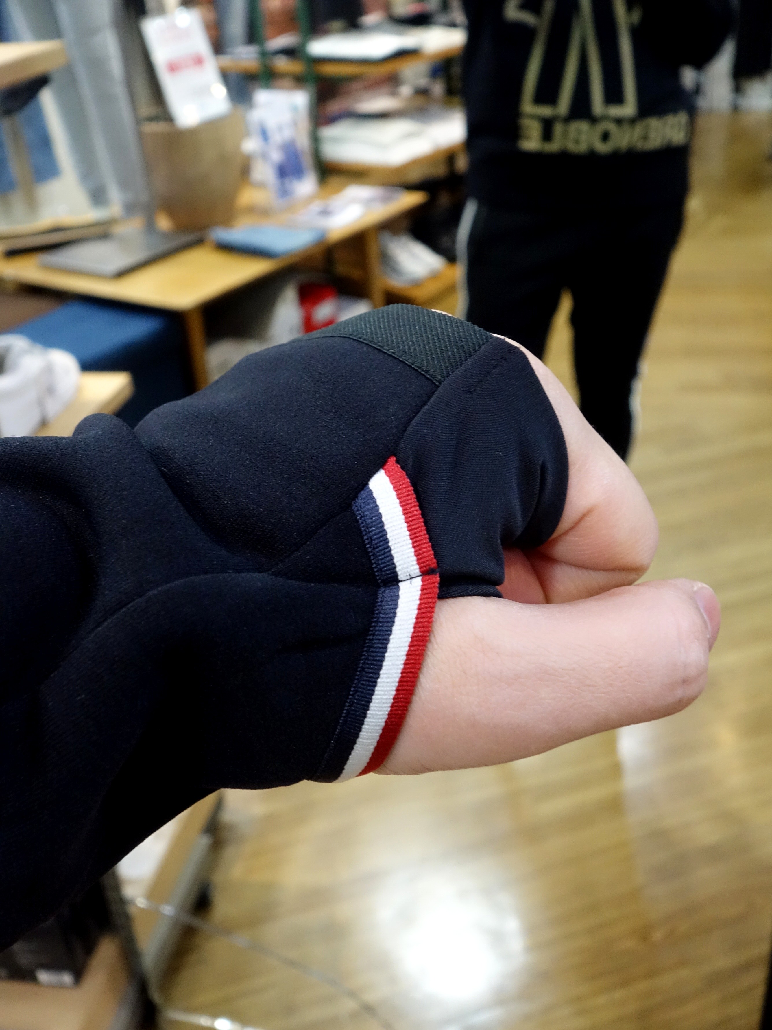 ■ネックにドローコード、袖口は甲までカバーするエラスチックインナーカフ