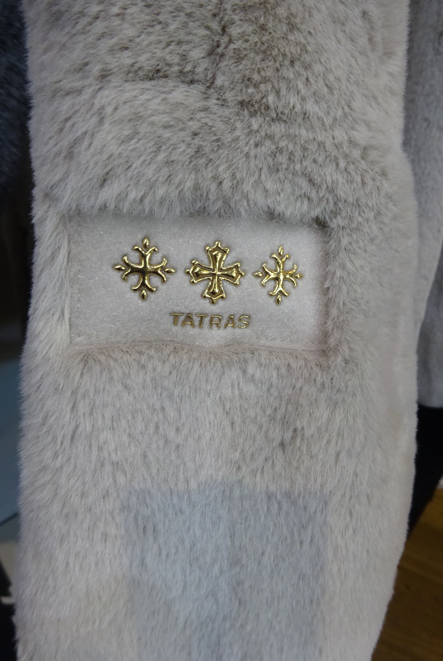 艶やかなラビットファー調のエコファーがフワフワしていて肌触りが最高です♪ |  左腕のタトラスのロゴマークも目を惹きますね♡ゴールドのカラーが高級感あります! |