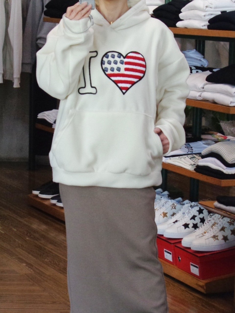 たっぷりな身頃にエアリーな着心地で癒されます♡ CREW『I♡(アイラブ)』の刺繍が目を惹く♪超軽量なフリース素材のプルオーバパーカです♪♪