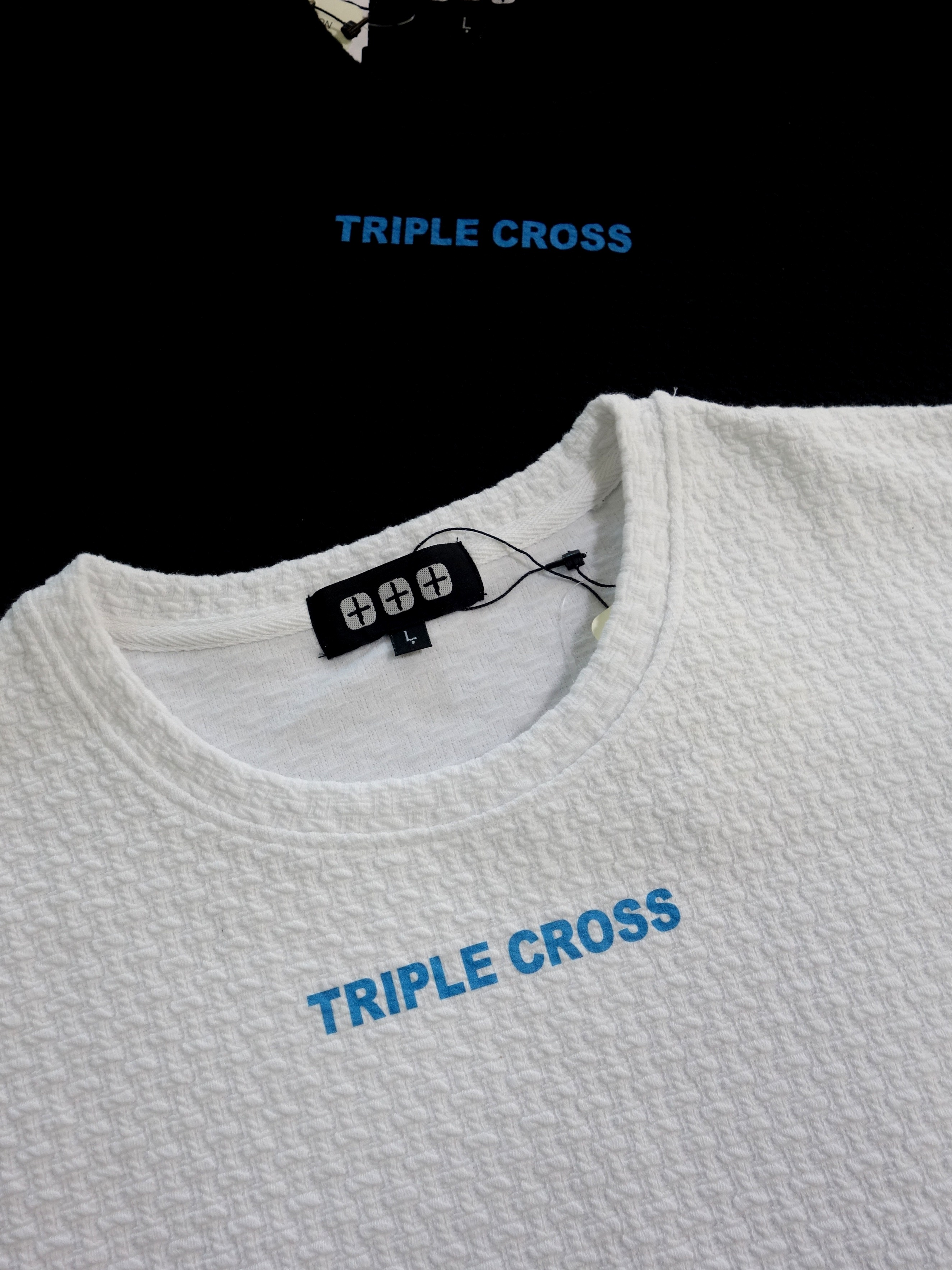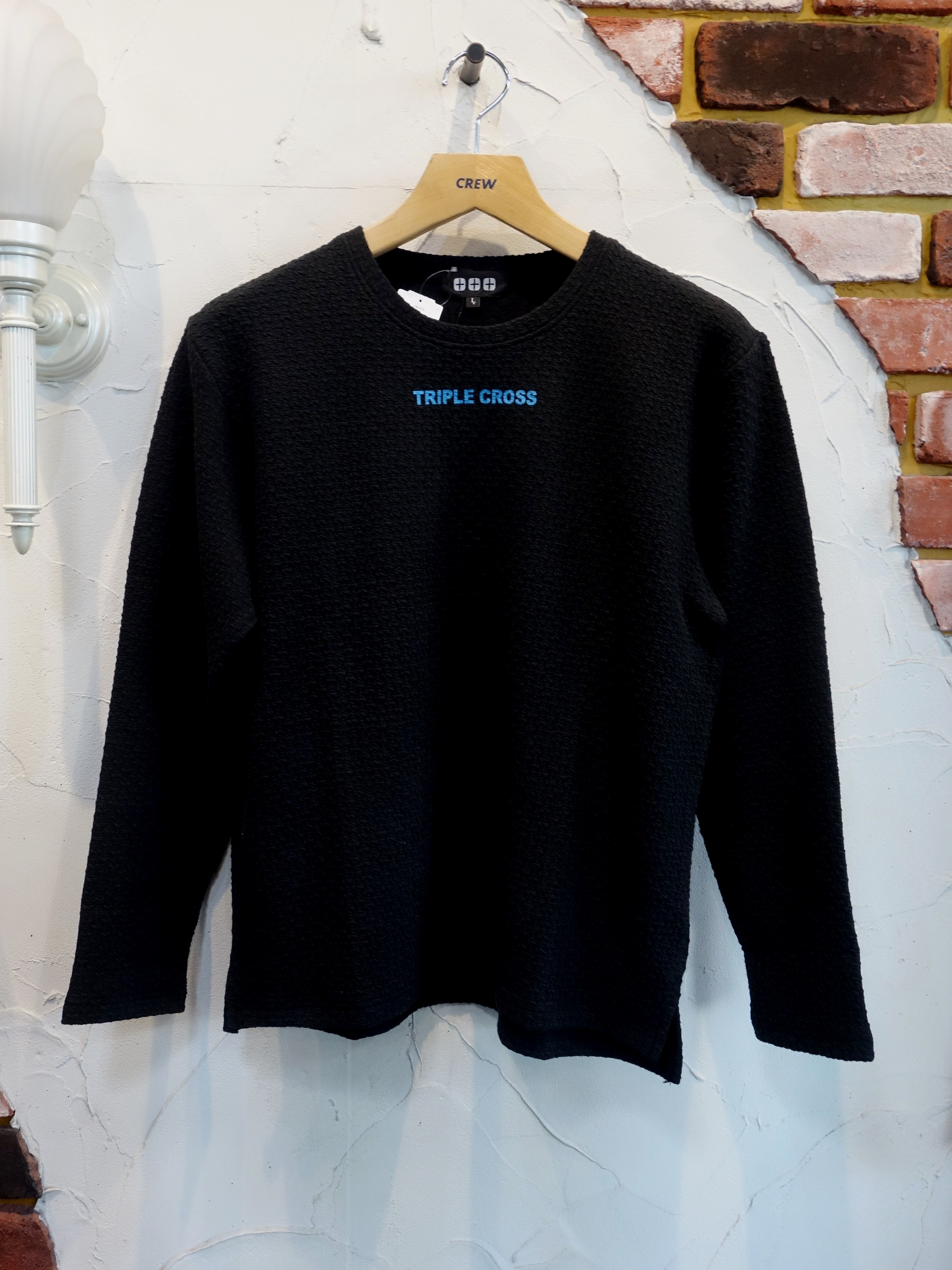 素材は凹凸のある格子柄のニットの様に柔らかなストレッチジャージ |  フロントにはNYブルーのTRIPLE CROSSスモールロゴ |