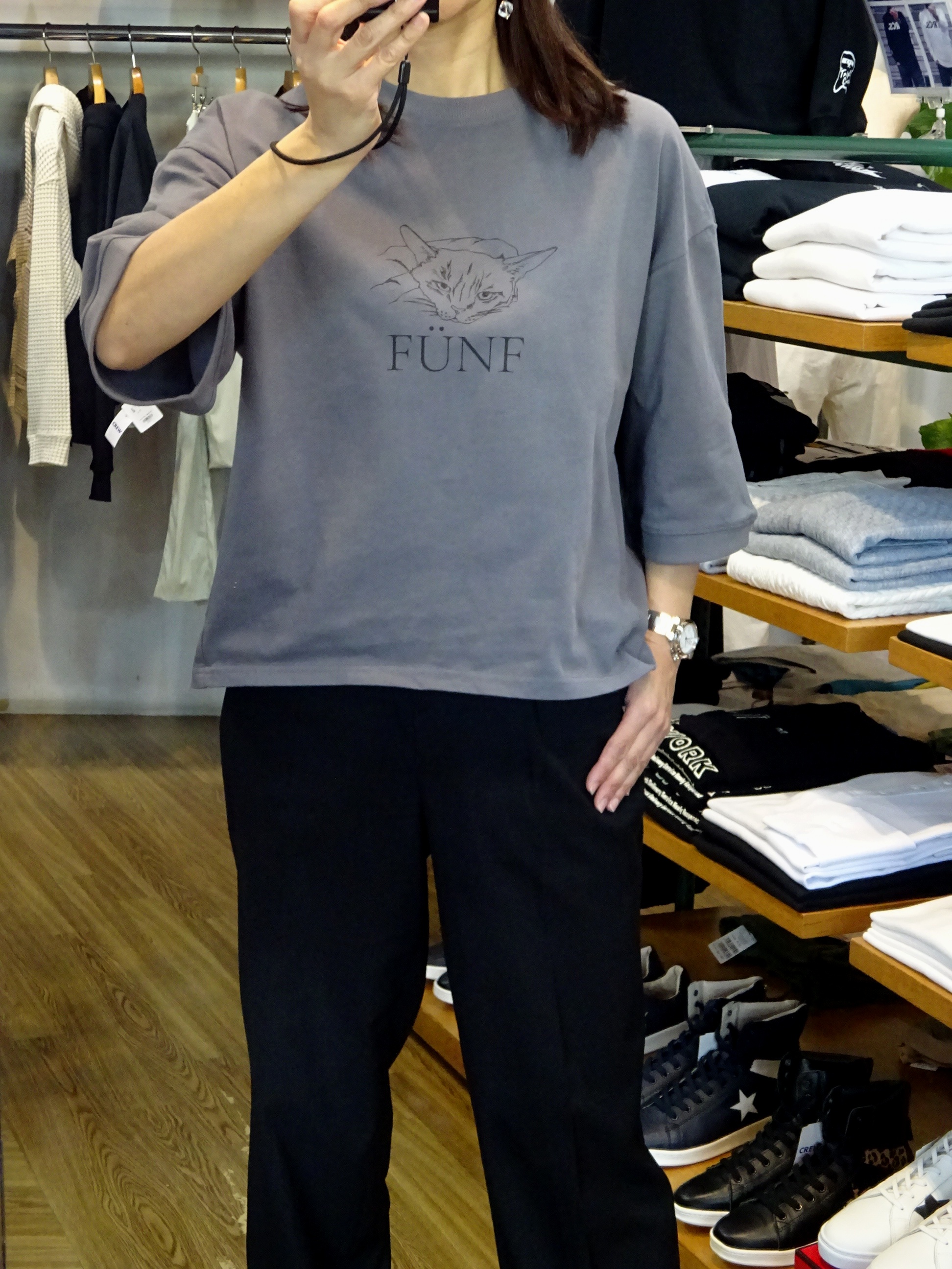 きれいめコーディネートにも合わせやすい大人っぽい猫ちゃんプリントが印象的ですよ!