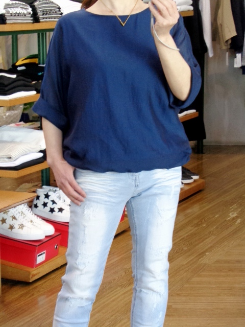 抜けのあるドルマンスリーブに袖口をロールアップしたゆとりの5分袖が気になる腕周りをカバーしてくれます( *´艸`)