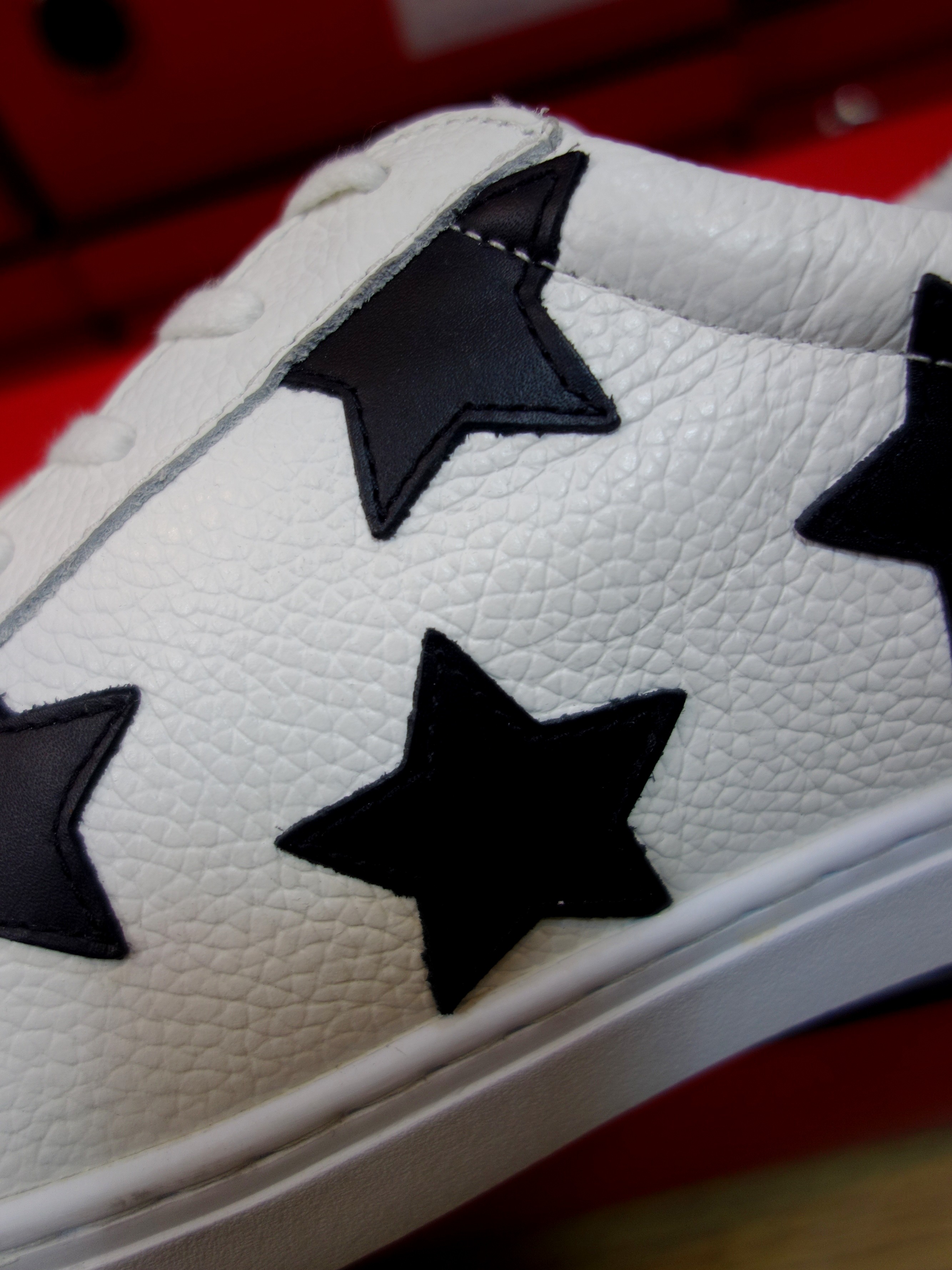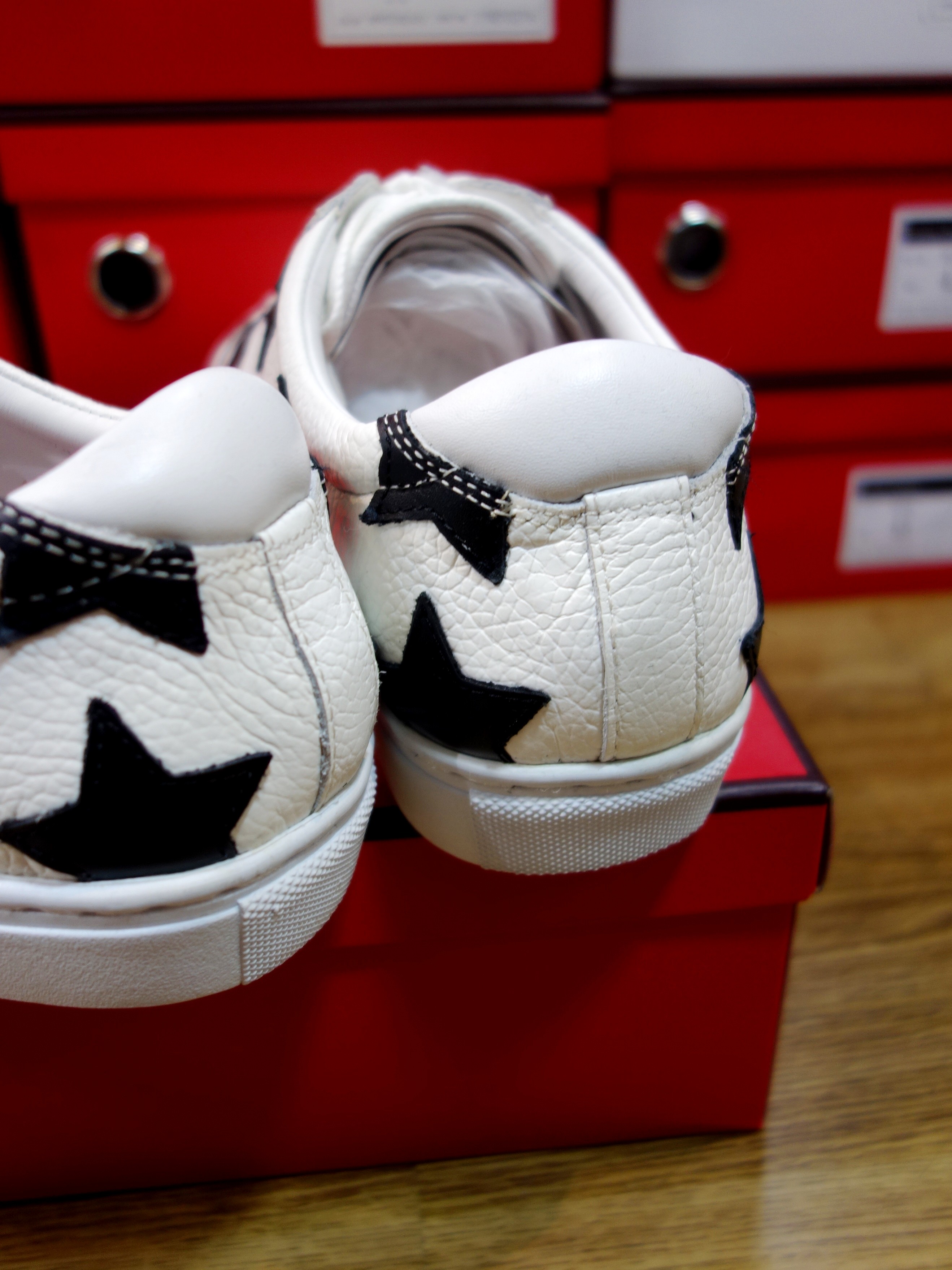 ■ロングノーズの美シルエットなレザースニーカーを★型レザーのアップリケでアップデート。