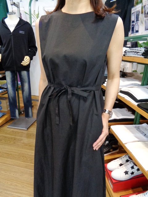 ワンピースと同布のリボン紐でシェイプしてきちんとした印象に!夏の羽織りを重ねてON/OFFと取り入れて頂けそうです★