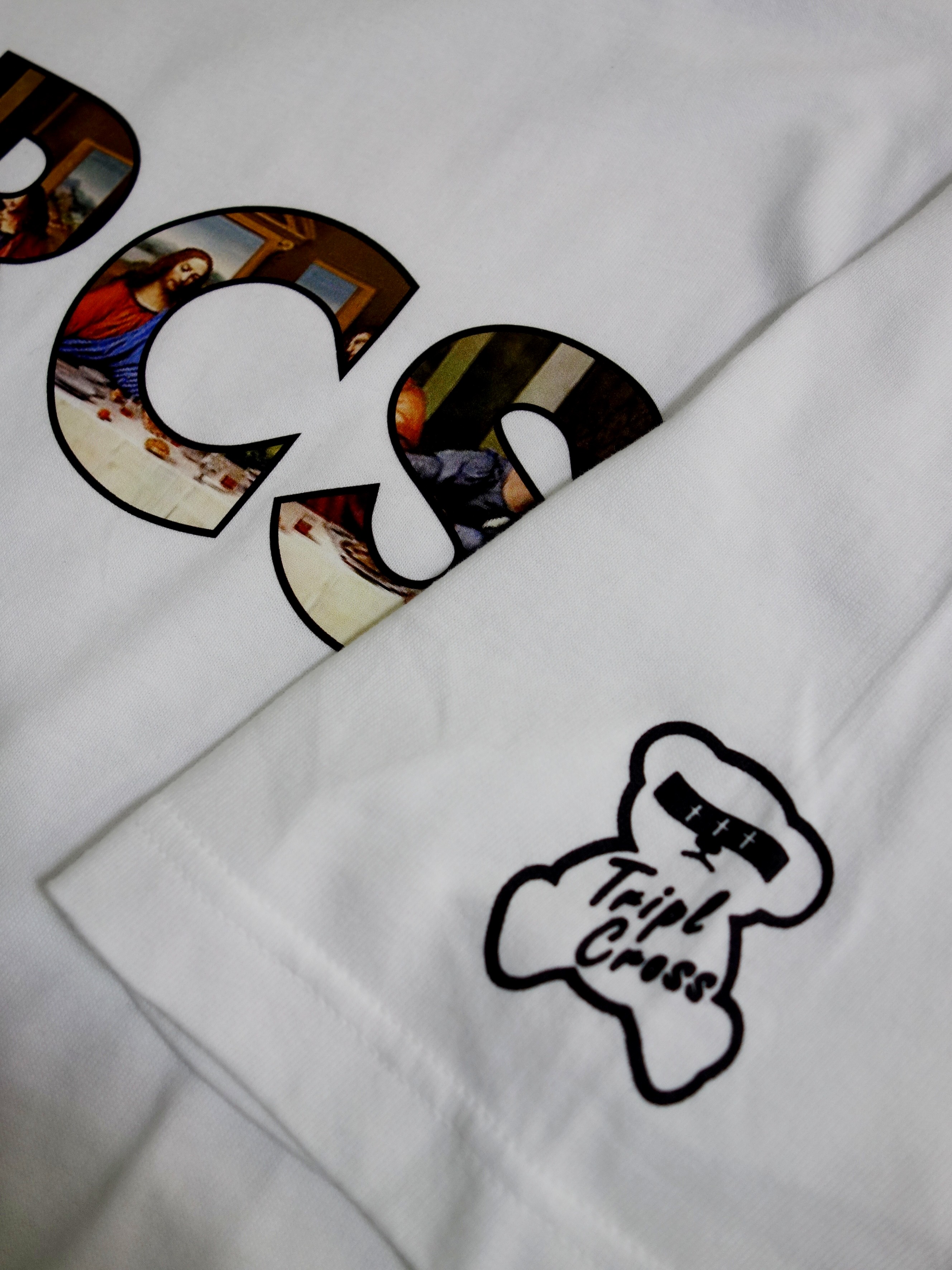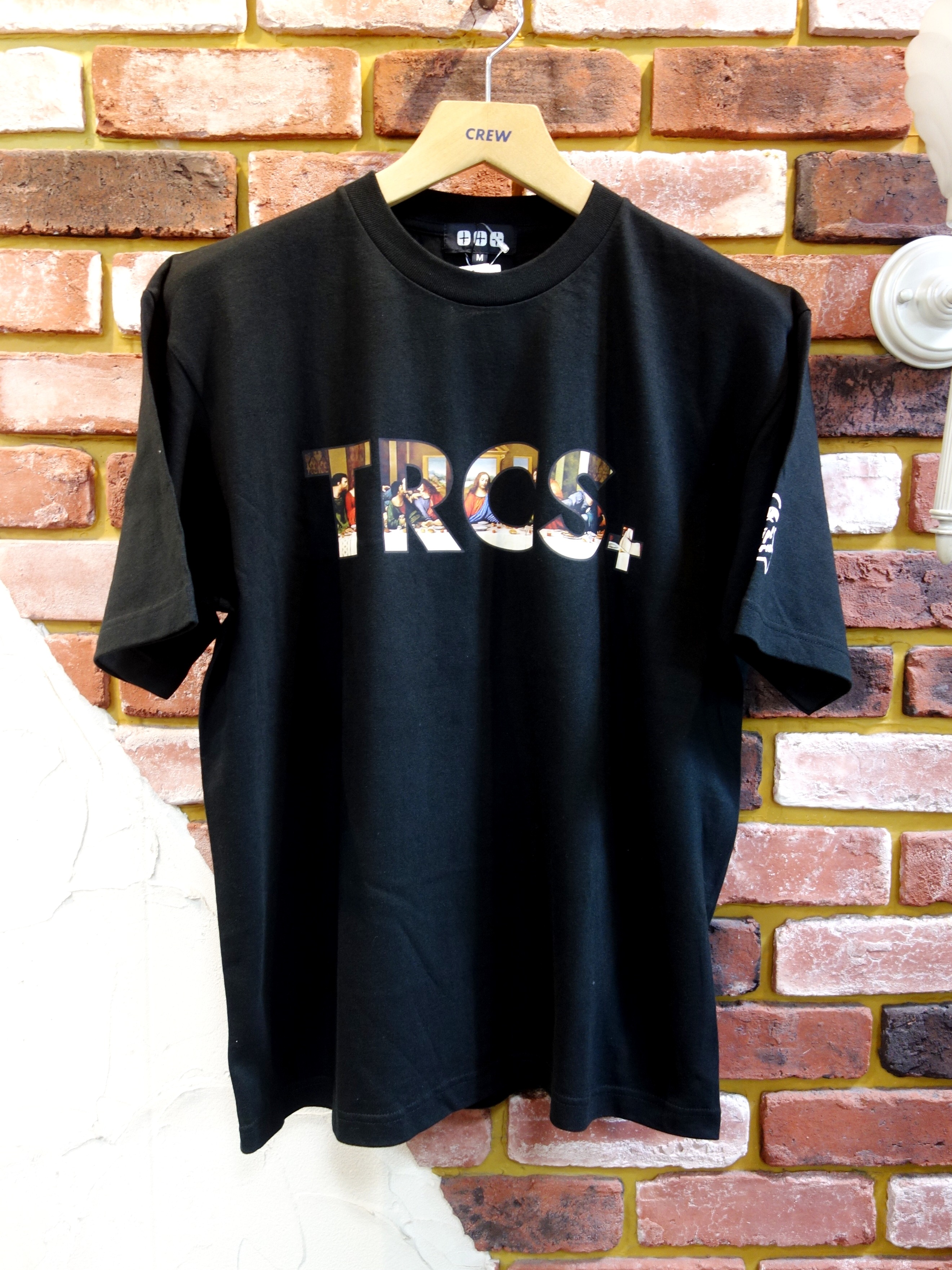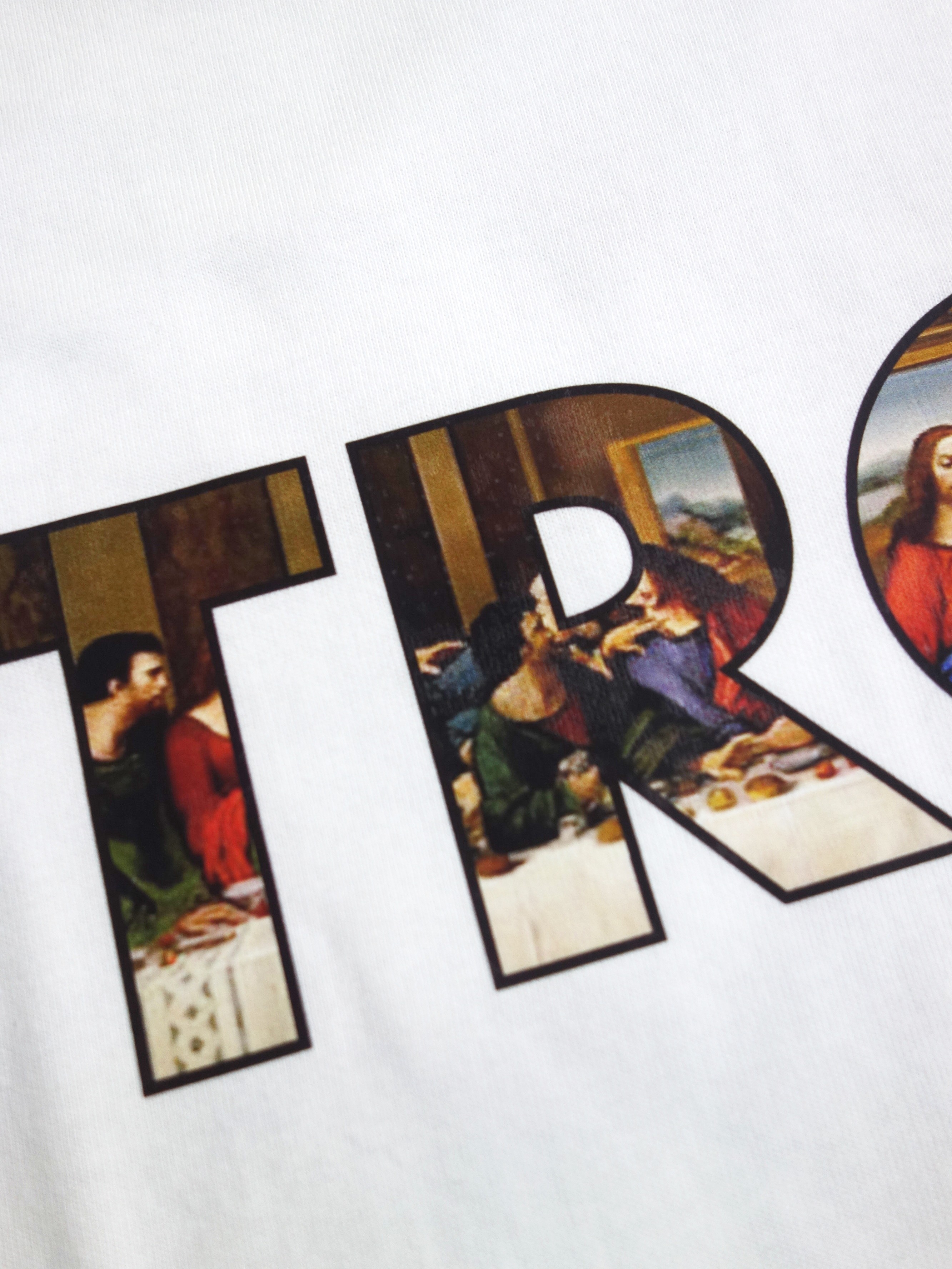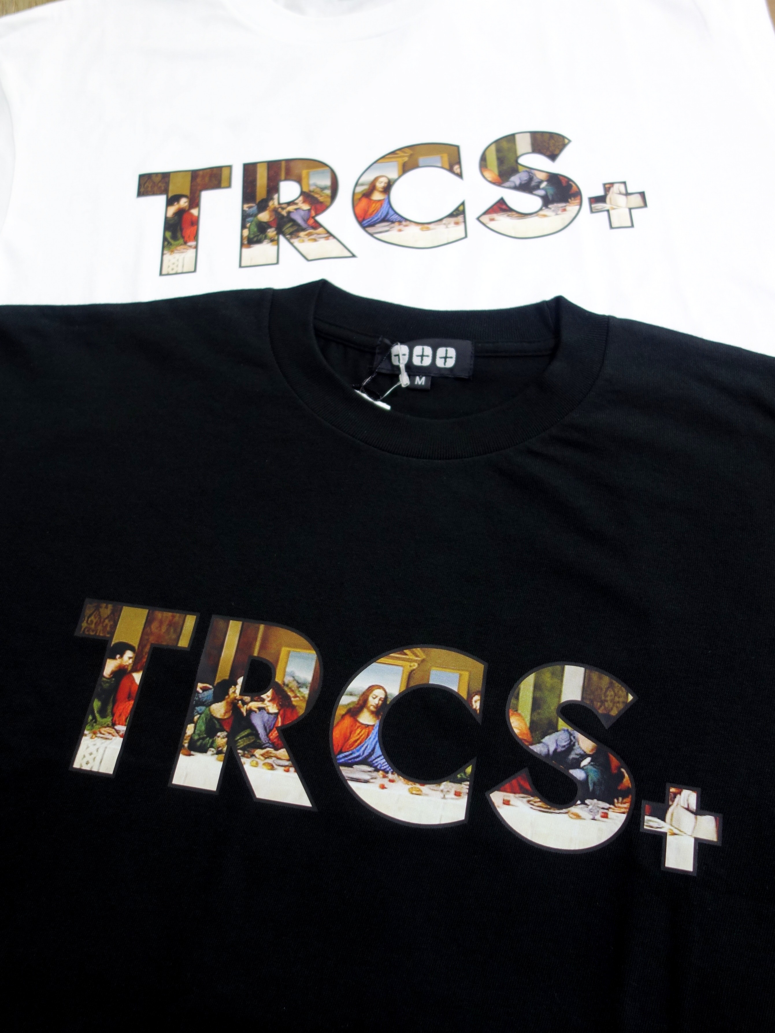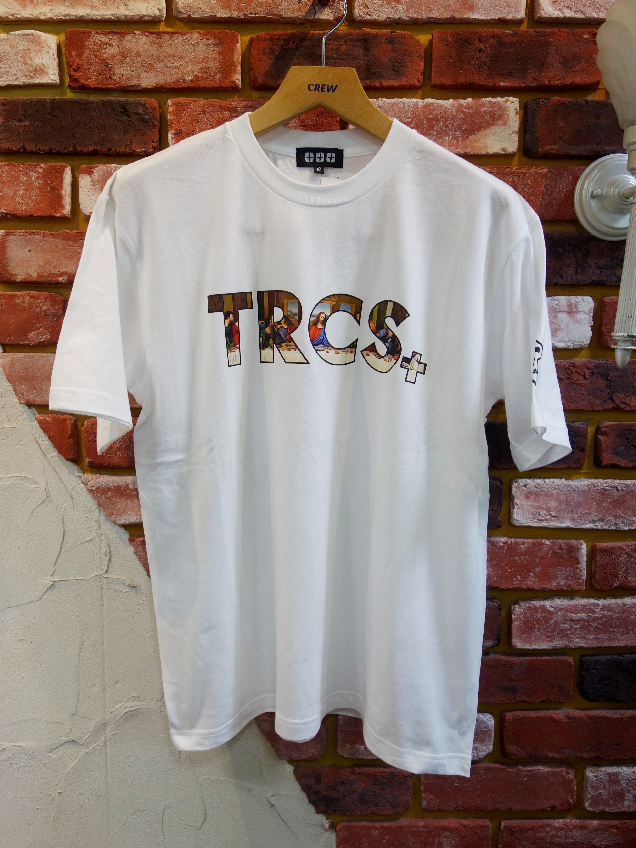 素材はコットンジャージ。着心地、サイジング共にバッチリです |  TRCSロゴの中にルネッサンスな「晩餐」プリント |