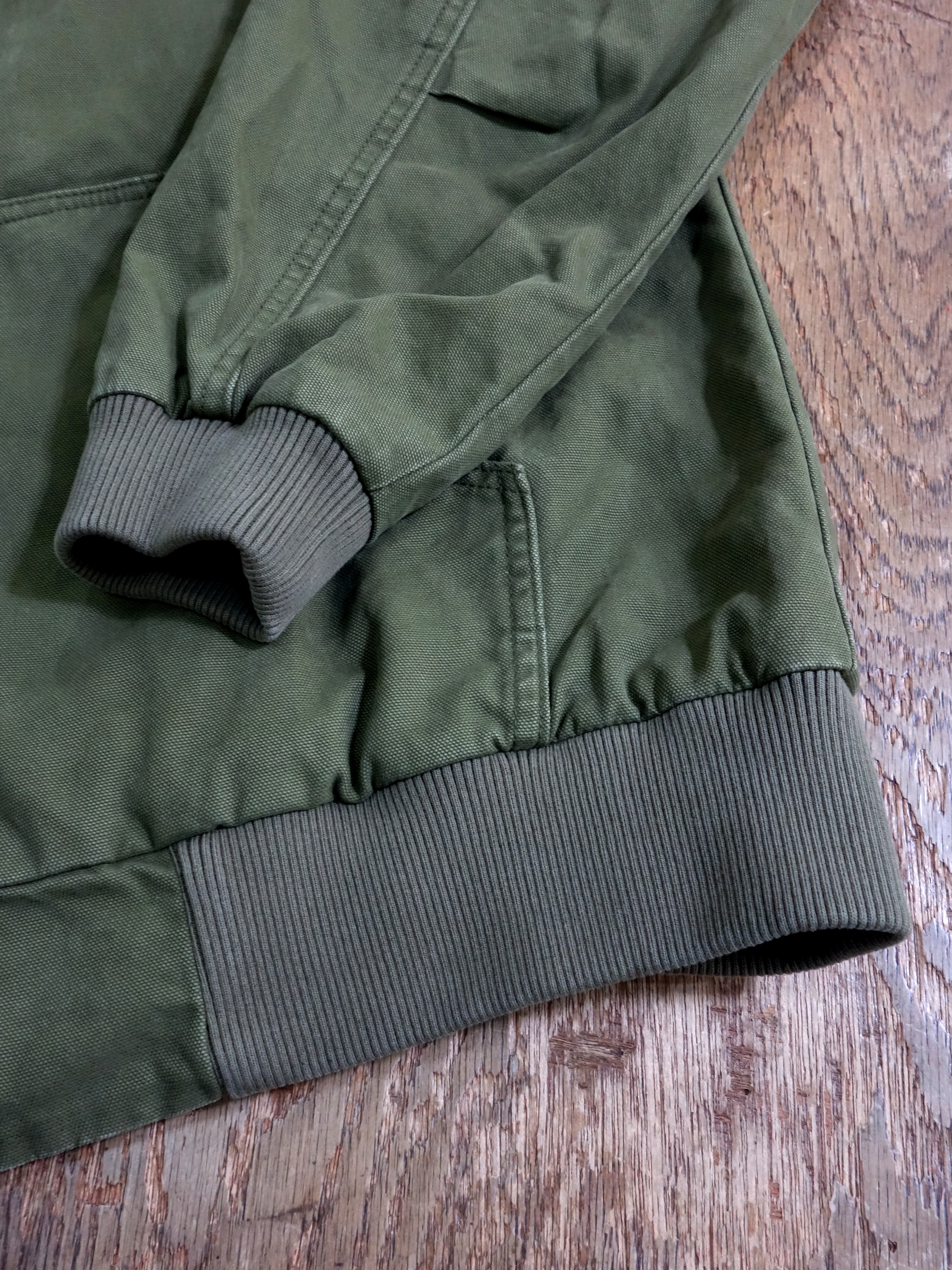 スタイルはルーズシルエットのフルジップパーカ。 袖、裾にリブ、フロントにはカンガルーポケット |  素材は太目のコットン糸を密に織り込んだダック地。 高い耐久性、難燃性を合わせ持つ丈夫な素材です |