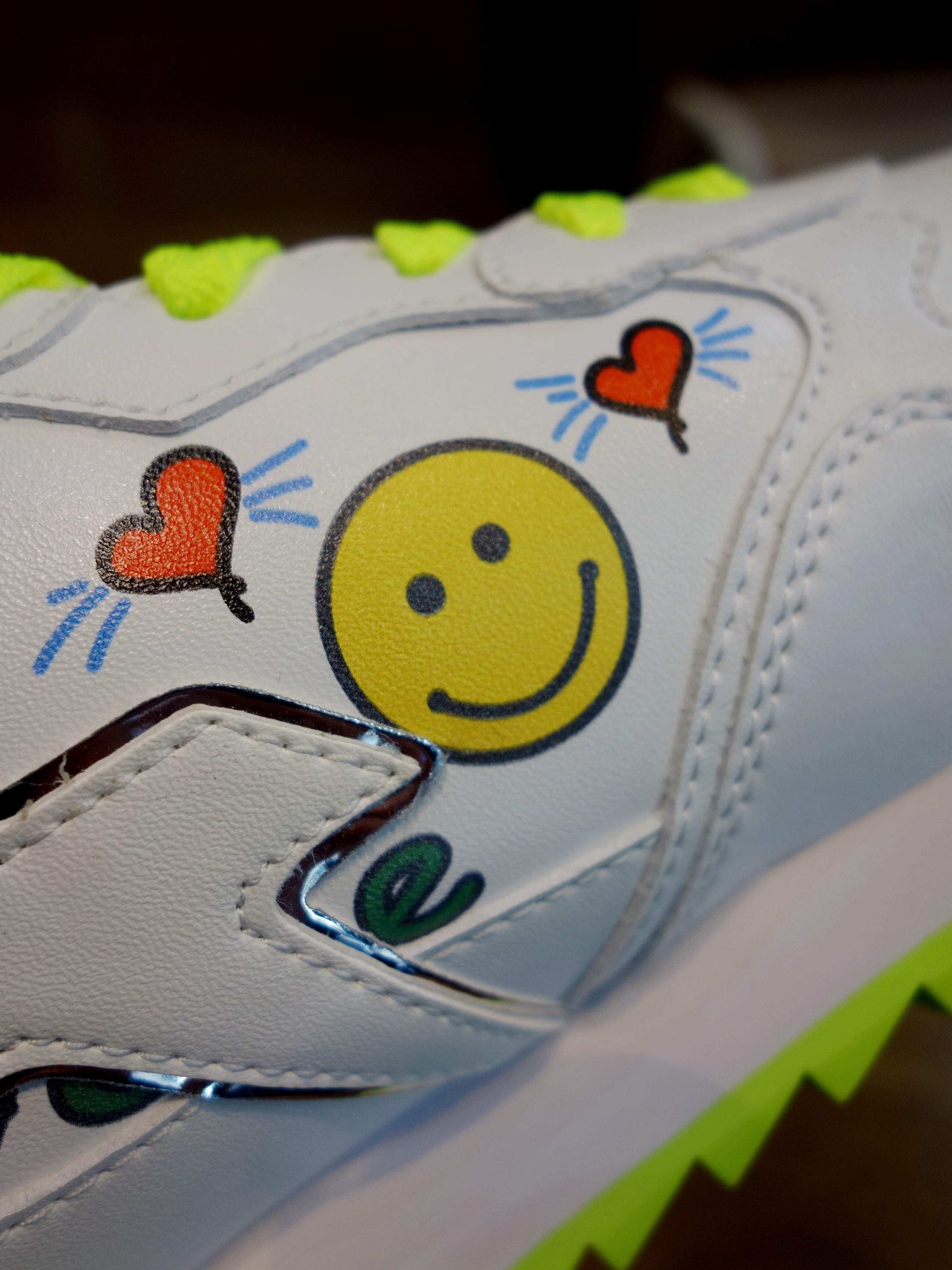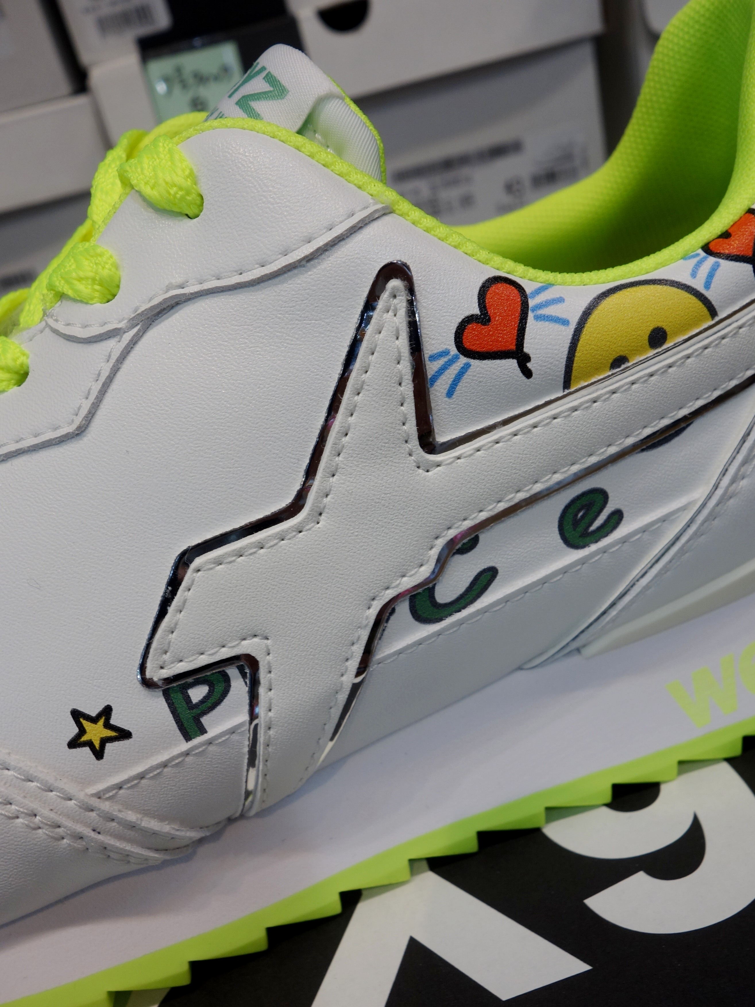 カラフルなイラスト&ネオンカラーのアクセント「PEACE」 |  スマイリー、ハート、スター、PEACEのハンドライテングプリント |