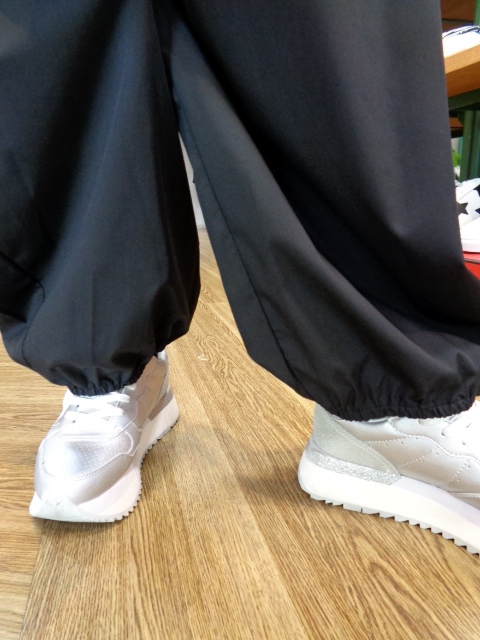 裾ゴムでふくらみのあるパラシュートパンツ風のシルエットが新鮮な黒パンツです✿
