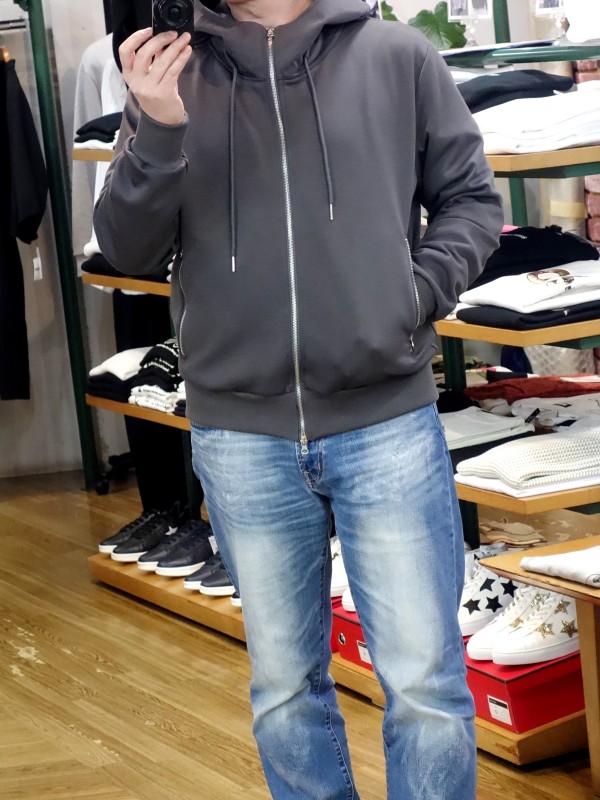 使い勝手の良いジャージ素材のフルジップパーカ。