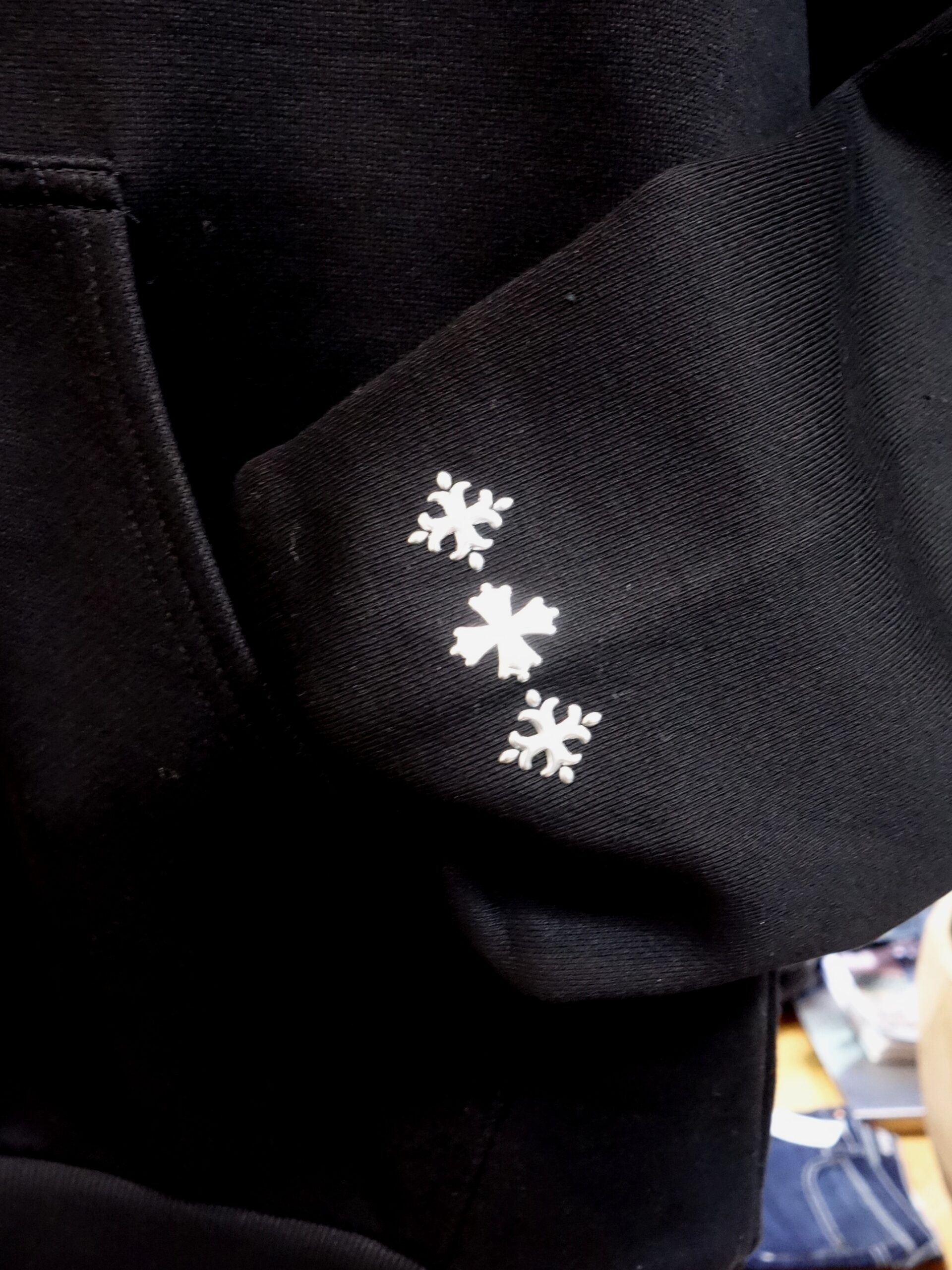 左胸にブランドロゴ、袖にクロスロゴのアクセント