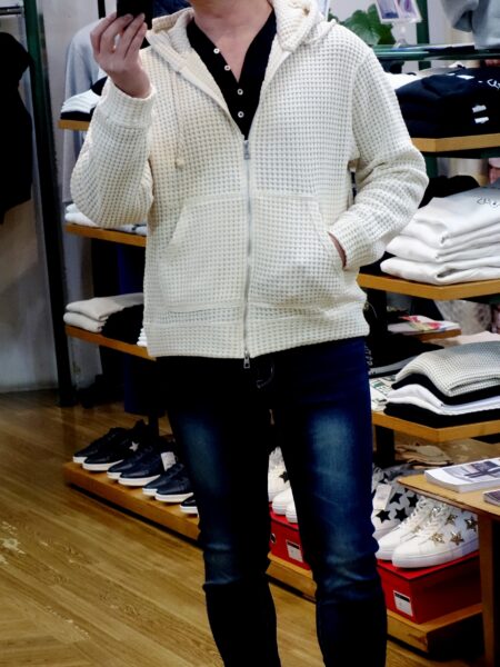 今回よりシルエットはワイド&ショートのオーバーサイズ、 フードコードもマリンロープ調にモデルチェンジしております。