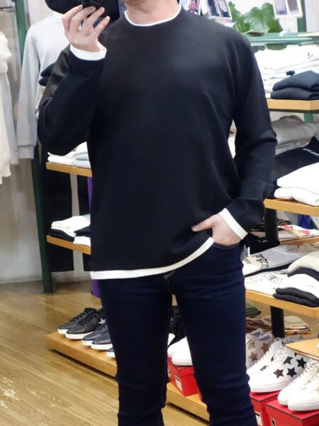 襟、袖、裾に生地を貼りレイヤード風に仕上げてあります