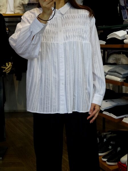 胸元のデザインと切替えられたストライプ調の織り柄が目を惹くシャツです!