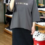 ⑤ロールアップされた7分袖にゆったりオーバーシルエットが絶妙な★キラキラなホイルプリントロゴのラグランカットソー『LUMINA』