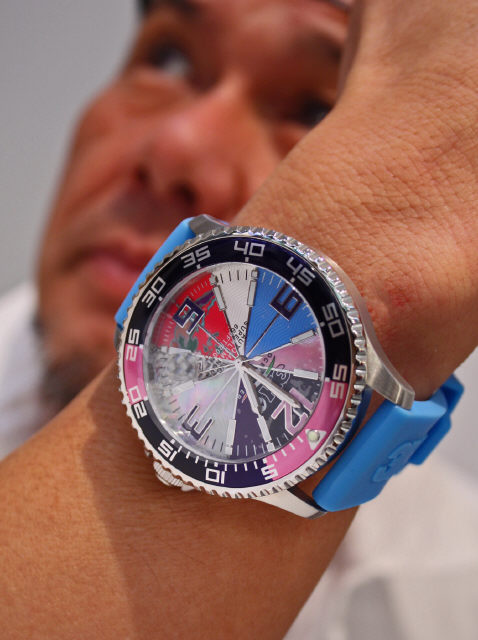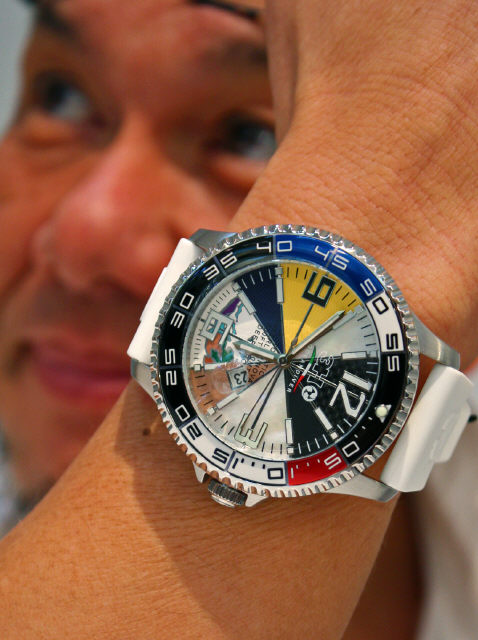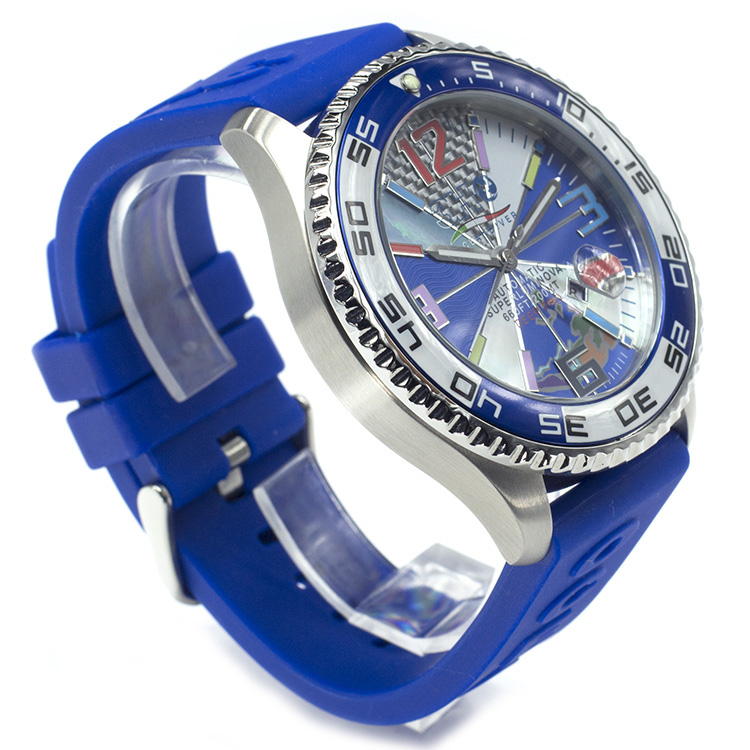 ①文字盤にはマザーオブパールを使用し、それを染めた豪華な文字盤