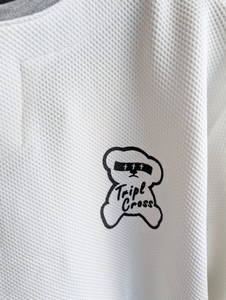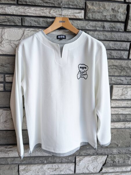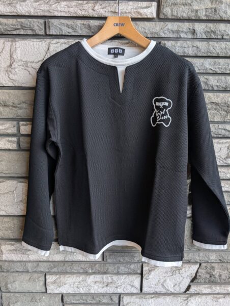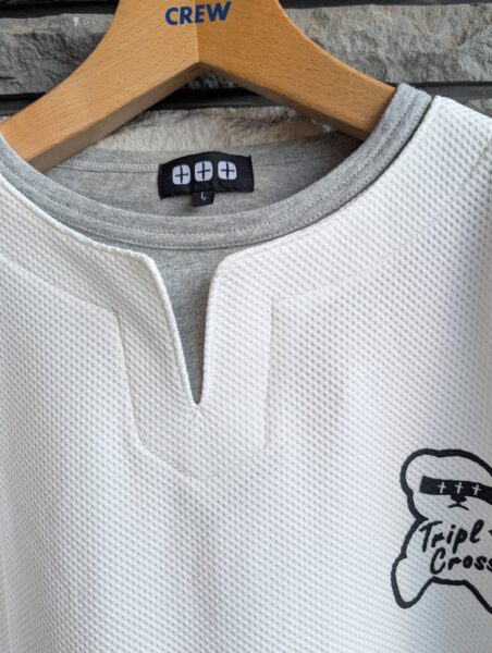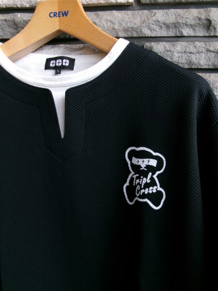 ★TRIPLE CROSSの【1930年代からのアメリカの労働者のインナーから発生したTシャツといえばヘンリーネックですよね】【それを現代版にアレンジした】重ね着Tネック長袖Tシャツをお値打ちに販売開始です!★★【¥4290(税込)と大変お値打ちです】★★【胸のくまちゃんもアイキャッチ抜群です】★★【アメリカの1930年代からの労働者の服と言えば、胸にボタンのついたヘンリーネックですよね】★★【そのヘンリーネックのボタン無しがTネックで、ヘンリーネネックよりもぬけ感があるデザインです】※丸首Tシャツの前部分をはさみ切って作っていたことから始まるファッションです★★【このTシャツは、Tネックを更にアメリカっぽく重ね着に風のでデザインにして、アメリカンな雰囲気を出しながら】★★【素材を水濡れ即乾燥のテック素材することにより、さわやかさと、きれいさをだしている長袖Tシャツです】★★1枚でもしっかりした存在感、インナーでも胸元に違いがでる長袖Tシャツです