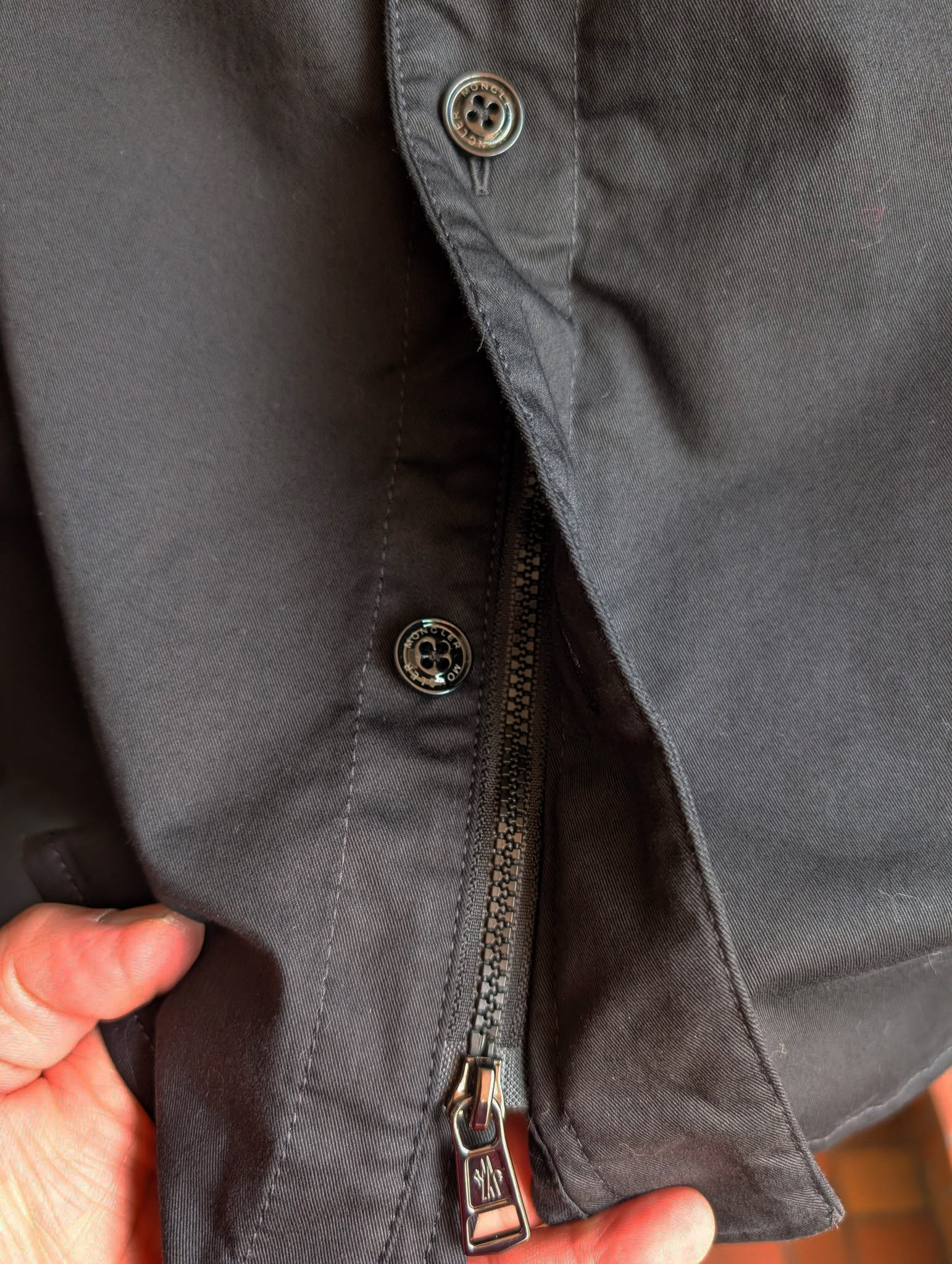 ★モンクレールの、ストレッチして、つるっとした肌触りで、ジッパーとボタンで留められる上質なシャツジャケットをアップしています